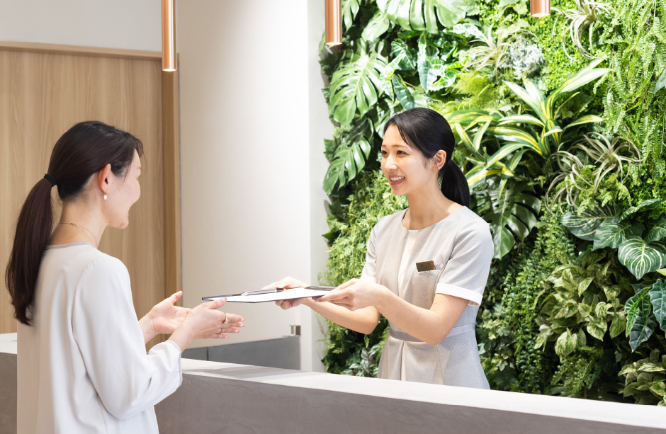 エレベーターを上がるとすぐに広がるエントランス、こちらの受付カウンターにてまずはご予約の確認とカウンセリング用の問診にご記入ください。