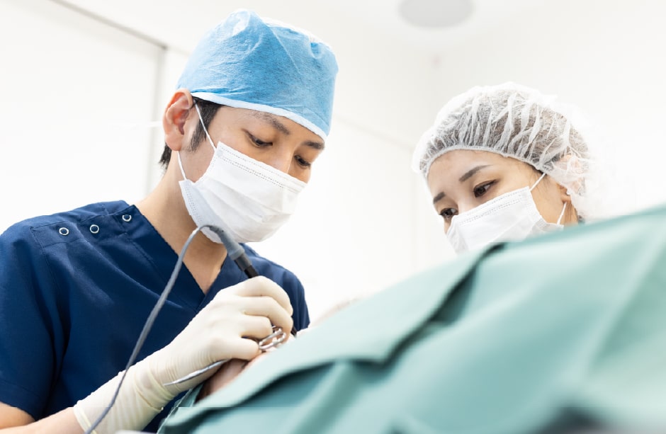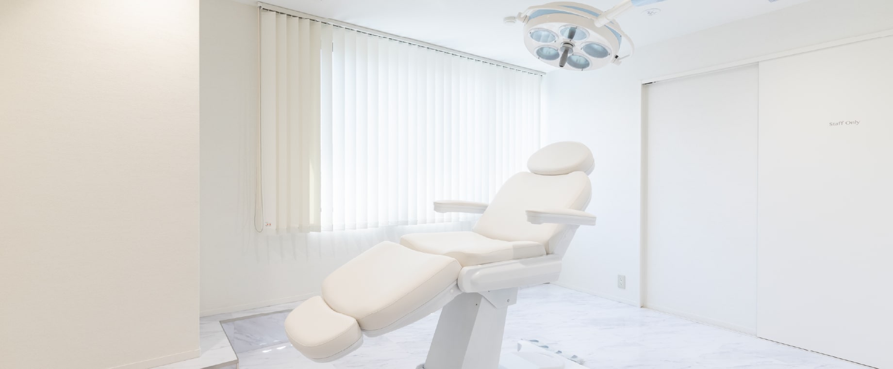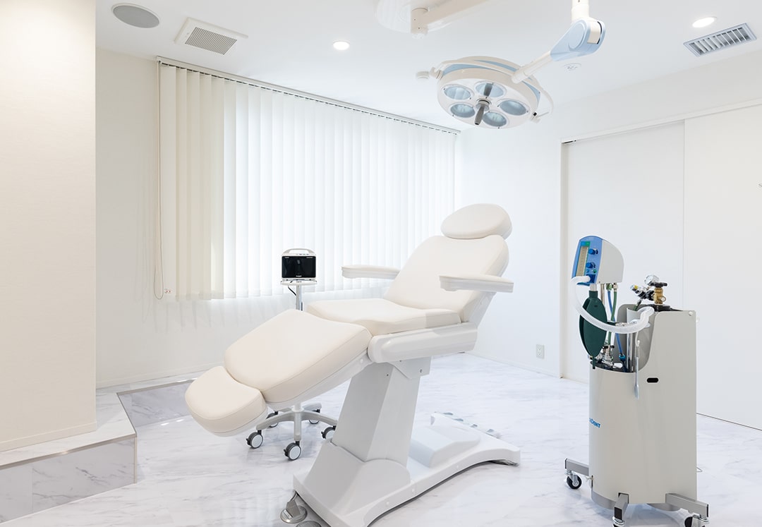 当院の切らない・腫れないクマ取り脱脂術をリラックスして受けていただける新しい手術台と機器、自然光が入る部屋は明るく清潔なスペースです。
