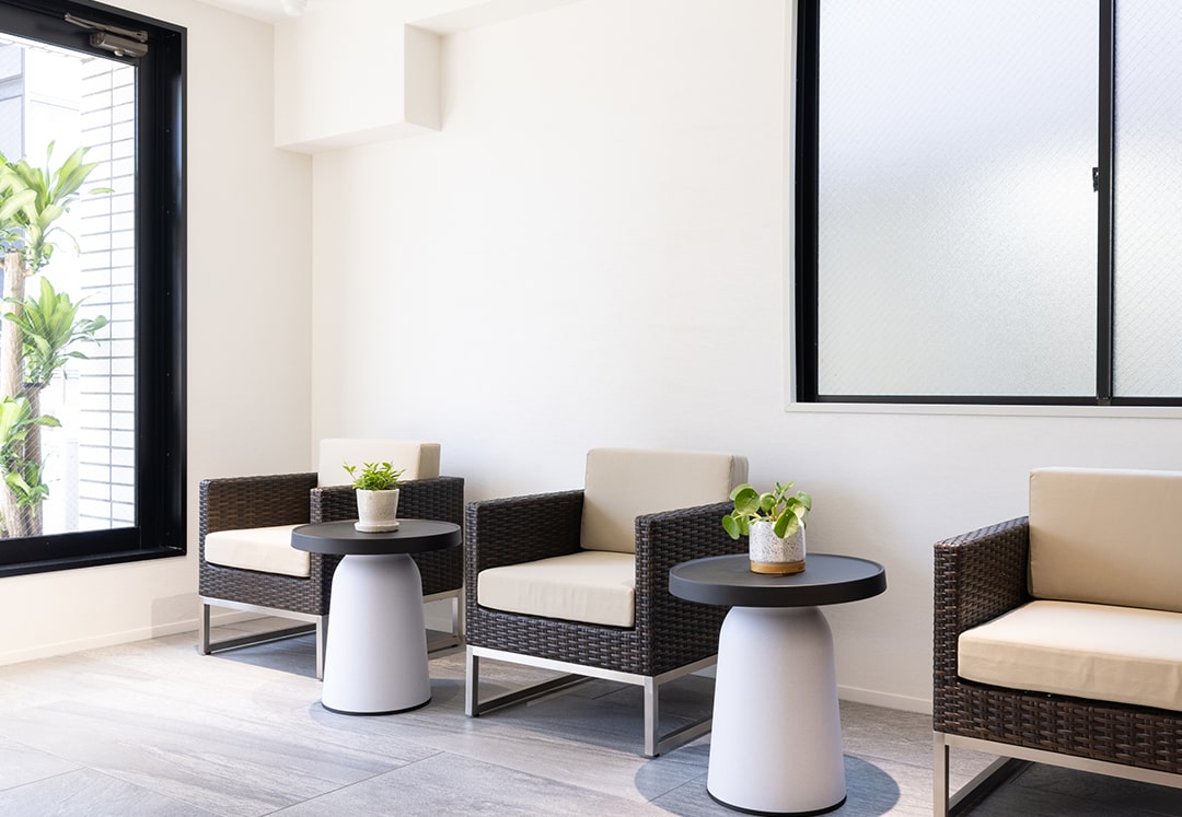 受付カウンター前の待合室、広めにとったエントランスホールでごゆっくり過ごしてるようなスペースになっております。