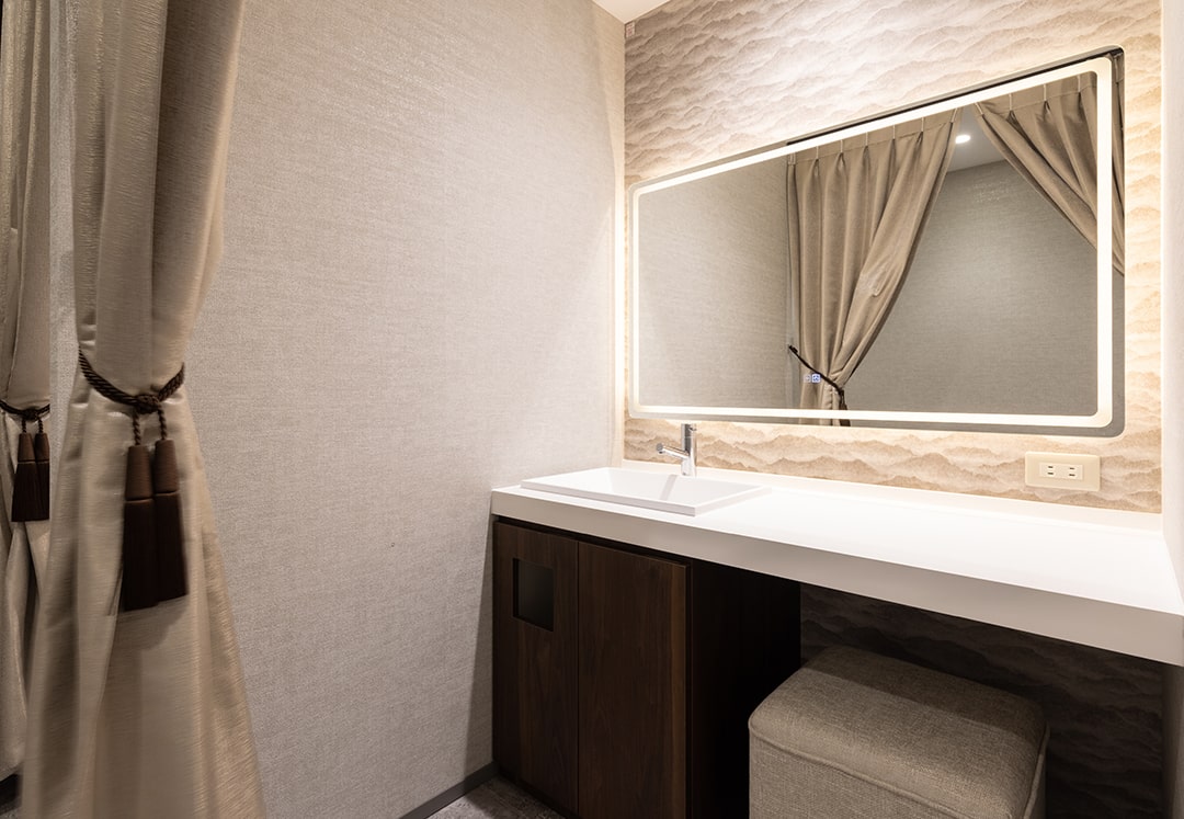 カーテンで仕切ることができる洗顔メイクルームは大きな鏡が印象的なスペース、鏡に設置したボタンでライティングの色の調整も可能です。